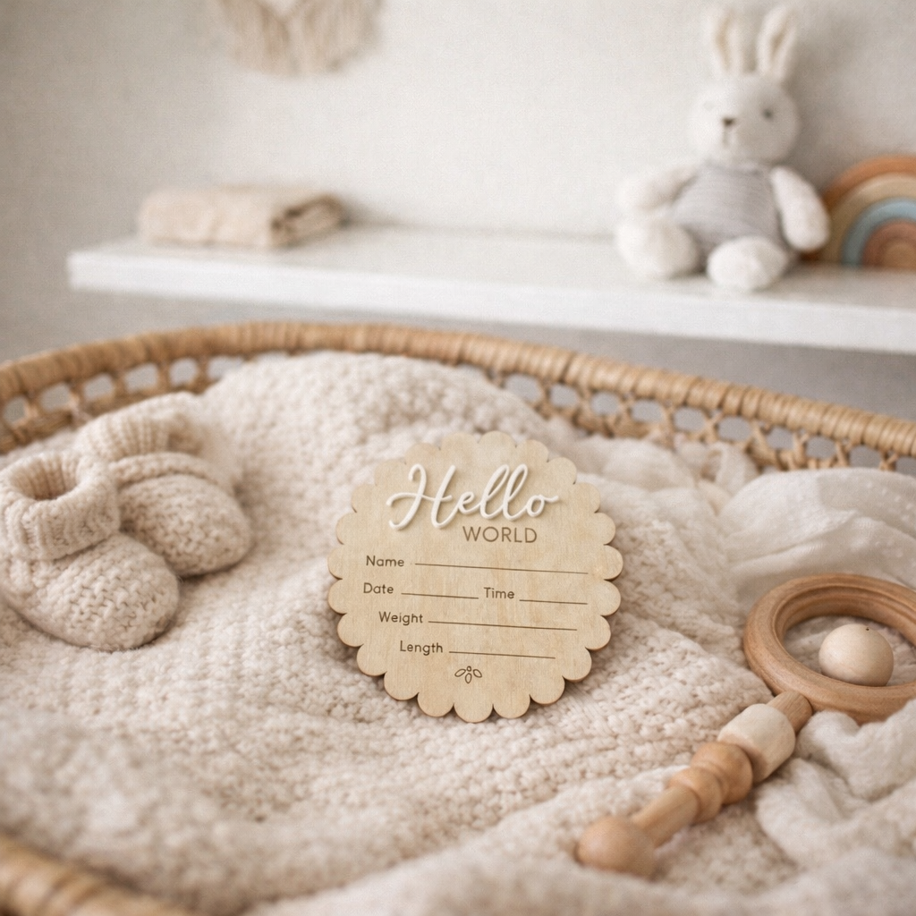 A charming wooden announcement disc with a scalloped edge and soft neutral design, featuring space to record baby’s name and birth details. Perfect for newborn photos, hospital moments and nursery styling—this timeless keepsake celebrates your little one’s first hello.
